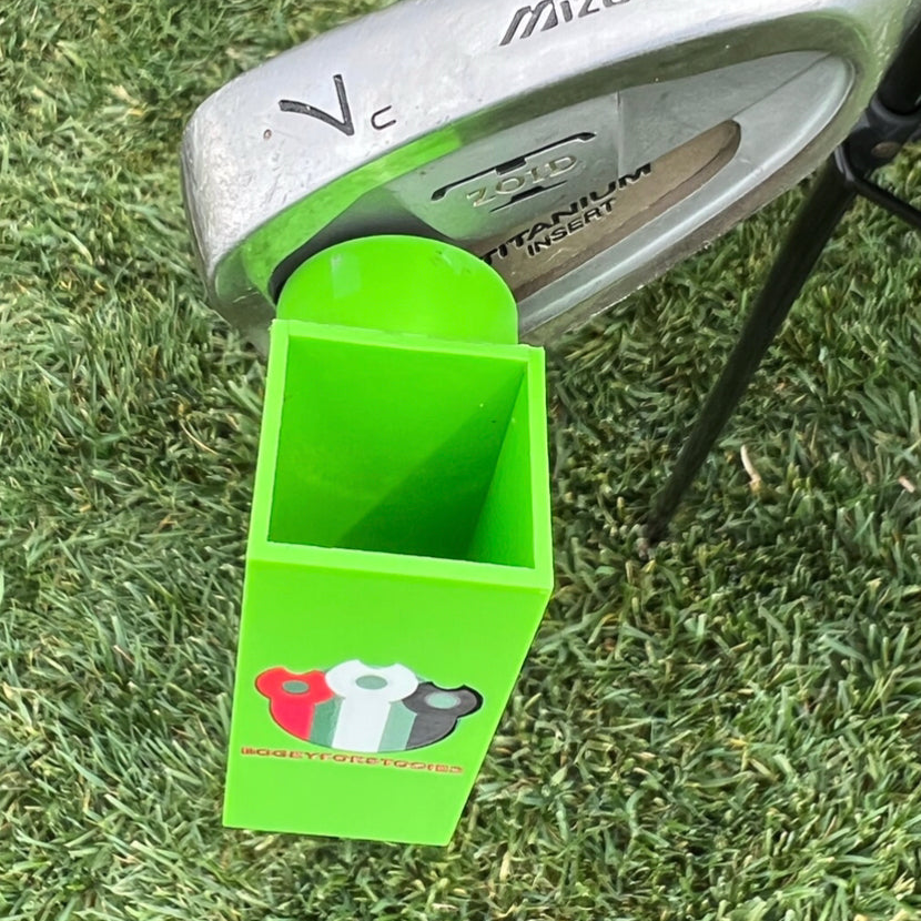 A magnetic holder that travels with your cart, and an elevated stand that fits securely in the tee holder — working together seamlessly throughout the round.